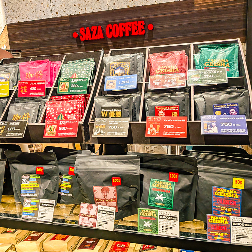店頭には、有名な「将軍珈琲」「パナマゲイシャ」といった、サザコーヒー自慢の豆が並んでいる。スペシャリティーコーヒーファンにはたまらない品揃えだ。仕事で疲れた日などはドリップオンを一袋、サッと買って自宅でゆっくり楽しむのもいいかもしれない。