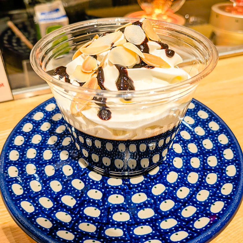 ↑世界一うまいコーヒーゼリー(税込610円)たっぷりの生クリームとアーモンドがトッピングされたコーヒーゼリー。珈琲の風味を引き立てるビターな味わいが特徴的だ。甘すぎないため、本格的なコーヒーとの相性も抜群である。